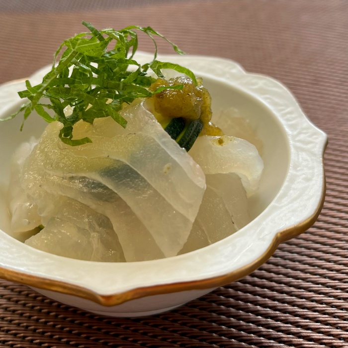 たことわかめのさわやか和え 真たこ(刺身用) 100g(食べやすい大きさに切る) ワカメ サッとゆでた状態で20g(食べやすい長さに切る) 肥前佐嘉角屋【野菜だれ】小さじ2 オリーブオイルまたはサラダ油 小さじ3 レモン果汁 1/4個分 お好みで青しそ 適量 ①たことわかめを容器に入れて【野菜だれ】オリーブオイル、レモン果汁で和える ②器に盛り付け青しそを添える