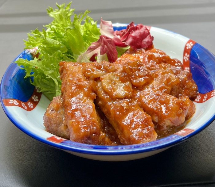 濃厚トンテキ (2人分) 豚ロース(厚切り)2枚 (叩いて広げ脂身を下にして1.5㎝幅の切込みを入れる) にんにくスライスまたは乾燥にんにく 8枚程度 肥前佐嘉角屋【野菜だれ】大さじ1 小麦粉 適量 サラダ油 大さじ1/2 ■ウスターソース 大さじ2 ■ケチャップ 大さじ2 ■砂糖 大さじ1 ■肥前佐嘉角屋【だし醤油】小さじ2 ※■の調味料は混ぜ合わせておく ・ レタスなど ①切込みを入れた豚ロースに【野菜だれ】をまぶし小麦粉をふる ②フライパンにサラダ油ひいて豚肉を両面焼き、戻した乾燥にんにくを加える ③豚肉に火が通たら■の合わせ調味料を加え全体を馴染ませ、レタスと一緒に器に盛り付ける