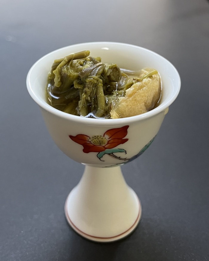 わらびの煮びたし (作りやすい分量) 茹でわらび 100g(あく抜き済み2~3㎝に切る) 油揚げ 2枚(油抜き短冊切り) 肥前佐嘉角屋【だし醤油】20㏄ 水 適量 砂糖 お好みで大さじ0.5 ①鍋に油揚げと【だし醤油】とひたひたの水を入れて加熱する ②①が沸騰して油揚げがしんなりしたら、わらびを加え30秒程度加熱し火を止める ③煮汁ごと冷まし、器に盛り付ける