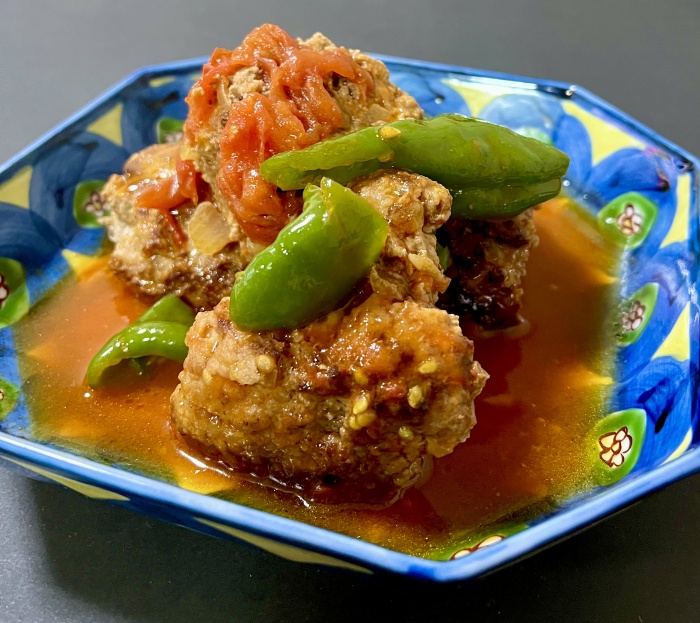 ワンパンひき肉とピーマンのトマト煮込み (4人分) 合挽肉 500g~600g 玉葱 1個(みじん切り) パン粉 大さじ4 水 50㏄ 食塩・こしょう 少々 ・ トマト3個~4個(乱切り) ピーマン 4個(縦割り種を取りさらに半分に切る) 肥前佐嘉角屋【だし醤油】40㏄ トマトケチャップ 大さじ3 ①深めのフライパンの中で挽き肉捏ね、玉葱みじん、パン粉、水、食塩、こしょうを混ぜ合わせて平らにする ②①に火をつけ中火~強火で焼き、ひき肉のふちの色が変わってきたらフライ返しなどで適宜大きさに分け裏返す ③②にトマトと【だし醤油】ケチャップを加え蓋をして中火で煮、最後にピーマンを加え更に煮る