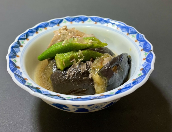 なすと鶏肉の炒め煮 (2人分) なす 3本(3~4㎝程度長さを縦4等分) 鶏もも肉 200g(一口大) 削り節 1g 唐辛子1/2本 (小口切り) ごま油 大さじ1 ・ 肥前佐嘉角屋【だし醤油】30㏄ 砂糖 小さじ2 水 適量 おくら 6本(ヘタを取る) ①フライパンにごま油をひいて中火で鶏肉を炒める ②①になすを加え全体に油が回ったら【だし醤油】砂糖、ひたひたの水、唐辛子を加えて煮る ③クッキングペーパーなどで落し蓋をしておくらを加え2分程度煮たら火を止め削り節をちらす