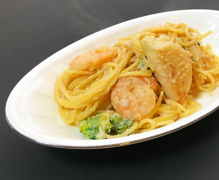 豆腐みそクリームパスタ (1人分) スパゲッティ 100g(茹で塩を加え麺を袋の表示通り茹でる) (※具材は豆腐みそディップソースに使用した残り) むき海老 3~4個 かぶ 1/2個(お好みの大きさに切る) ブロッコリー 小房に分けた3個程度 オリーブオイル 大さじ1 ◆豆腐みそディップソース 大さじ3 食塩 こしょう 少々 ①フライパンを熱しオリーブオイルで野菜やえびを炒める ②①に豆腐みそディップソースとゆで汁大さじ1を入れ茹でたスパゲッティを加え火を止め全体を絡める ③器に盛り付ける