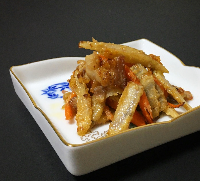 豚バラみそ金平 (2〜3人分) 豚バラ 150g(食べやすい大きさに切る) ごぼう 140g(約2/3量 斜め切り) 人参 90g(2/3短冊or斜め切り) ごま油 小さじ1 鷹の爪 1〜2本 酒 大さじ2 肥前佐嘉角屋【米味噌】 大さじ2 肥前佐嘉角屋【ごま醤油】大さじ1 砂糖 小さじ1 ①酒〜砂糖はよく混ぜ合わせておく ②フライパンを熱し、豚バラ〜鷹の爪までを炒める ③炒まったところに①の調味料を入れ加熱し器に盛り付ける