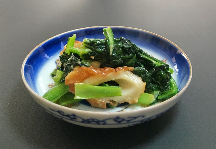 小松菜と竹輪のわさび味噌炒め (3〜4人分) 小松菜 5株(約230g)(3〜4㎝に切る) 竹輪 4本(斜め切り) サラダ油 適量 わさびチューブ 小さじ1 肥前佐嘉角屋【米味噌】大さじ1 酒 大さじ1 食塩 少々 ①フライパンを熱し、サラダ油を入れ小松菜と竹輪を炒める ②【米味噌】とわさびチューブを酒で溶かし①に加えさっと炒め合わせて食塩で味を整える ③器に盛りつける