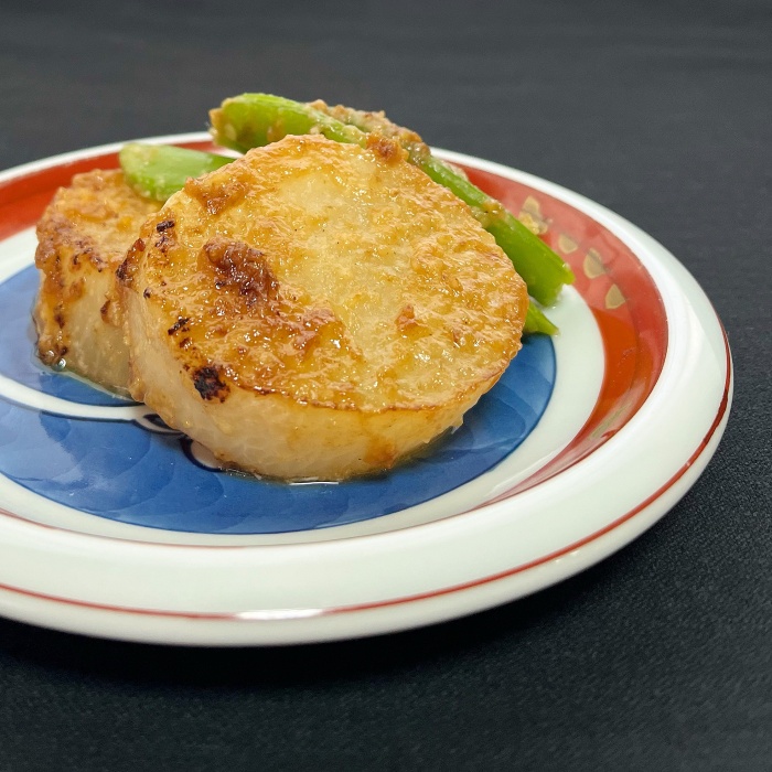 大根の味噌バターステーキ (2人分) 大根 200g(輪切り、両面格子切り) (合わせ調味料) ◆肥前佐嘉角屋【米味噌】 大さじ1 ◆酒 大さじ1 ◆砂糖 小さじ1 ◆バター 10g 葱など お好みで ①大根は約4分程レンジでチンして柔らかくする ②フライパンを熱しバターで大根を焼き軽く焦げめをつけて合わせた調味料を入れ絡める ③皿に盛り付ける