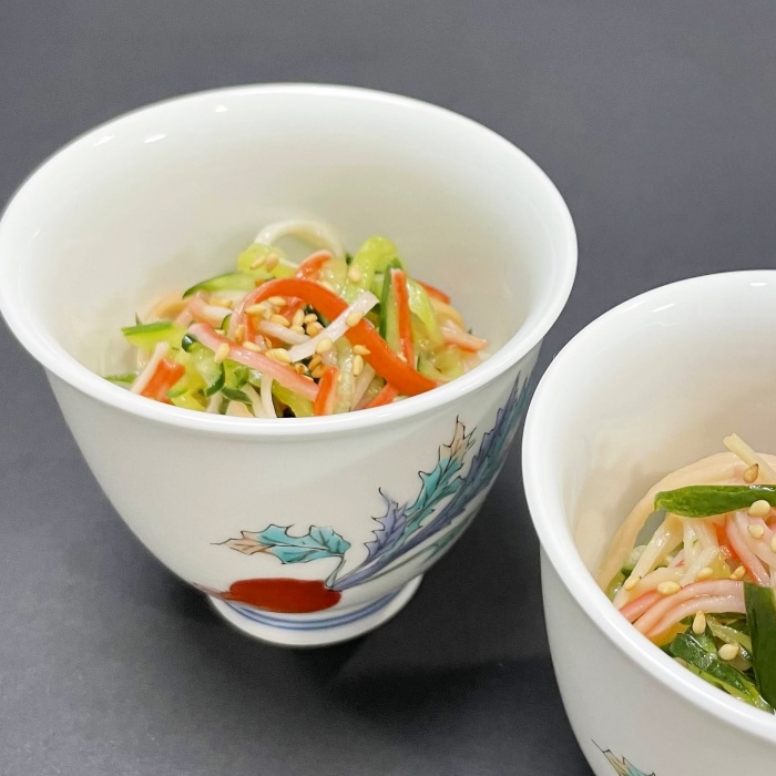 カニカマきゅうりナムル (2~3人分) きゅうり 2本(細切り) カニカマ 5本(ほぐす) 肥前佐嘉角屋【野菜だれ】 大さじ1 肥前佐嘉角屋【丸大豆醤油】小さじ1 ごま油 大さじ1 白ごま 適量 ①きゅうりに野菜だれをかけ揉み込み、水分が出てきたらよく絞る ②ボウルに①、カニカマ〜ごま油までをよく混ぜる ③器に盛り付け、白ごまをかける