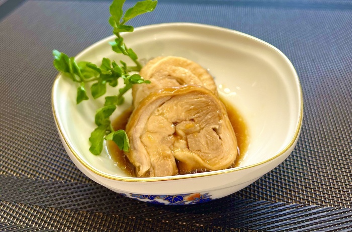 セミナーレシピ 鶏ももチャーシュー~レンジ料理~ (2本分) 鶏もも肉 2枚(約600g) 肥前佐嘉角屋【丸大豆醤油】大さじ4.5 酒 大さじ6 砂糖 大さじ1.5 生姜チューブ 2㎝ ・ クレソンなど ①鶏もも肉の厚い部分に切れ目を入れ開き、厚みを均一にして皮目を下にし、手前からきつめ に巻いて、5ヶ所ほど爪楊枝でとめる ②大きめの耐熱容器に調味料を全て入れ混ぜ合わせる。①の巻き終わりを下にし、ふんわりラッ プし600w5分レンジ加熱。鶏を裏返し、再度ラップをかけ、4分加熱。そのまま庫内で10分 程余熱で火を通す ③②の粗熱がとれたら爪楊枝を抜き、お好みの厚さに切り、器に盛り付ける