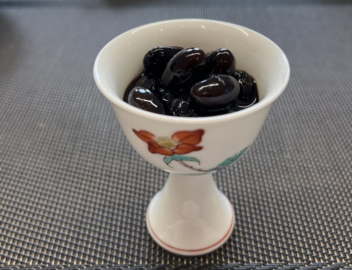 セミナーレシピ 黒豆~赤ワイン入り~ (作りやすい分量) 黒豆 200g 水 豆の3~3.5倍量 重曹 小さじ1 砂糖または中ザラメ 150g 食塩 小さじ1/4 肥前佐嘉角屋【丸大豆醤油】大さじ1弱 鉄分サプリメント 3粒 (またはさび釘) 赤ワイン 50㏄~100㏄ ①水、砂糖、食塩【丸大豆醤油】、重曹、鉄分サプリを鍋に合わせて火にかけ沸騰させる火を止 めて洗った黒豆を入れ7~8時間浸しておく ②①を強火にかけ沸騰したら灰汁をとり弱火にして落し蓋をして煮る(1時間弱)その後一旦火 を止め冷ます ③冷めた②に赤ワインを加え弱火にかけお好みの柔らかさにする