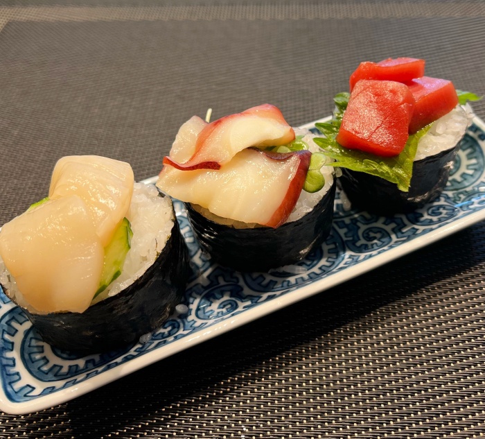 セミナーレシピ 海苔巻きオードブル 精白米 2合(いつも通り洗米する) 寿司酢または 酢 大さじ4 砂糖小さじ2 食塩 少々 ・ 焼き海苔 適量 まぐろ お好み量(食べやすい大きさに切る) 肥前佐嘉角屋【丸大豆醤油】まぐろの下味用 ホタテ お好み量(食べやすい大きさに切る) 肥前佐嘉角屋【野菜だれ】ホタテの下味用 たこ お好み量(食べやすい大きさに切る) 肥前佐嘉角屋【だし醤油】たこの下味用 かいわれ、青しそ、胡瓜など ①ご飯に合わせ酢を加え混ぜて冷ます ②海苔を巻きすの上にのせ①を広げて巻き、端を切って6等分する。残りも同様にする ③②に下味を絡めたまぐろ、ホタテ、たこなどをのせて器に移し、貝割れなどを添える