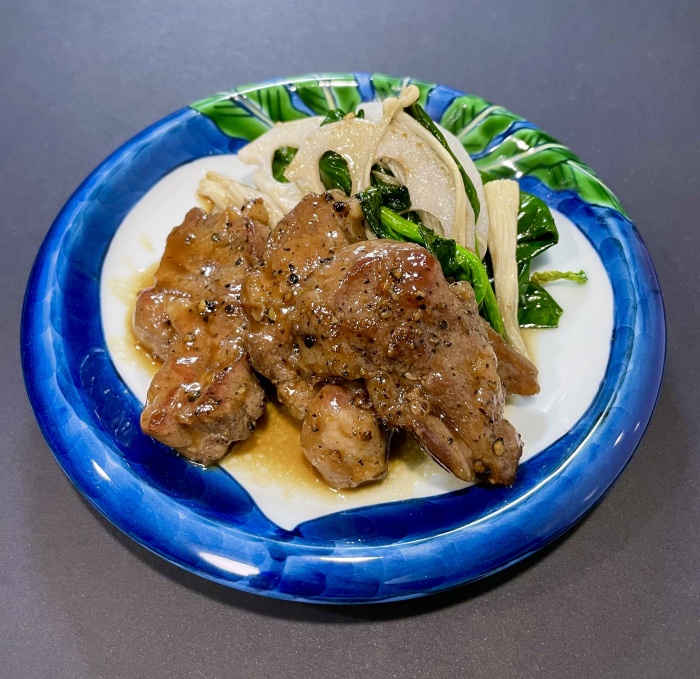 豚肩ロース煮込み (作りやすい量) 豚肩ロースブロック 約400g(食べやすい大きさに切る) にんにく 1かけ(潰す) 肥前佐嘉角屋【野菜だれ】大さじ1 ブラックペッパー 適量 オリーブオイル 適量 ★庄分酢【美味酢】 (甘みのある調味酢)1/2カップ ★肥前佐嘉角屋【丸大豆醤油】 大さじ2 ★水 1カップ ・ 蓮根ソテー お好みで ①豚肉に【野菜だれ】を全体にかけ、ブラックペッパーも振っておく ②フライパンを熱し、豚肉を両面焦げ目がつくように焼く(この後煮るので火が入ってなくてOK) ③②に★を入れ、落とし蓋と蓋をし、弱火で15分ほど煮込む。落とし蓋と蓋を外し、煮汁が少なくなるまで煮詰め煮からめる