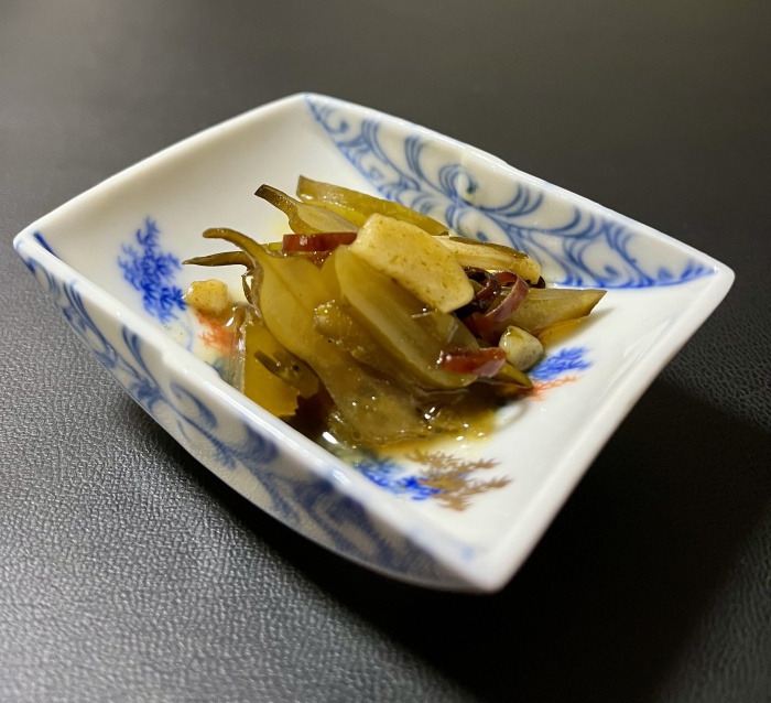 綾里のめかぶピリ辛炒め (作りやすい分量) 生めかぶ茎部分 3本(斜め薄切りにする) ごま油 大さじ1 乾燥にんにく 5〜6枚 輪切り唐辛子 お好み量 砂糖 大さじ1 肥前佐嘉角屋【丸大豆醤油】小さじ2 肥前佐嘉角屋【だし醤油】大さじ1 ①フライパンにごま油、乾燥にんにく、輪切り唐辛子を入れ中火にかける ②①の香りが出てきたら切った生めかぶを加え、めかぶの色が鮮やかなみどり色になるまで炒める ③砂糖、【丸大豆醤油】【だし醤油】を加え炒め煮て水分がなくなったら器に盛り付ける