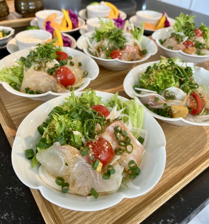 にんにく醤油ドレシング 鯛のサラダ仕立て (2人分) 鯛刺身または柵 約150g(お好みの厚さにスライス) 肥前佐嘉角屋【野菜だれ】大さじ1 グリーンカールなどのレタス類 1/2個分(食べやすい大きさにちぎる) 新玉ねぎ 1/2個(薄スライス) ミニトマト、万能ネギ、大葉 お好み量 ⚫︎肥前佐嘉角屋【野菜だれ】 大さじ2 ⚫︎肥前佐嘉角屋【丸大豆醤油】大さじ1 ⚫︎ごま油 大さじ1 ⚫︎市販のスライスにんにく お好み量 ⚫︎すりごま 大さじ ①鯛に【野菜だれ】を絡めておく ②⚫︎調味料を全て混ぜ合わせる ③大きめな器にグリーンカール、新玉ねぎ、鯛を盛り付け、お好みでミニトマトなども盛り付ける。②をかける