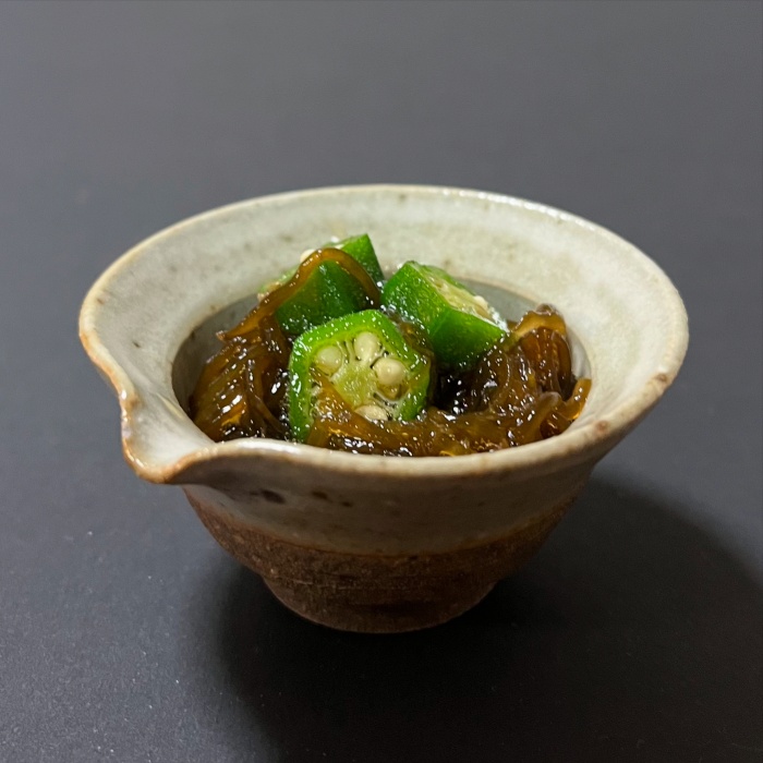 もずくおくら (2人分) もずく 100g程度(水洗いして水気を切る) おくら 3本(ヘタを取りラップに包み600wレンジ加熱1分) 肥前佐嘉角屋【だし醤油】小さじ1 ■穀物酢 大さじ1~1.5 ■肥前佐嘉角屋【丸大豆醤油】大さじ0.5 ■砂糖 大さじ1 ①加熱したおくらを小口切りにして【だし醤油】で下味つけ冷ます ②ボウルにもずくと①のおくらを混ぜ合わせる ③■調味料で合わせ酢を作り、②と合わせ酢を混ぜ合わせて調味し器に盛り付ける