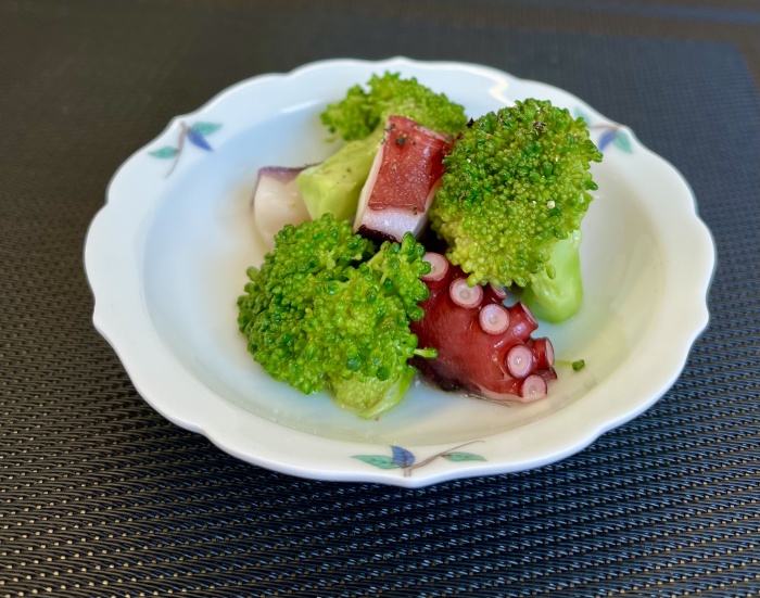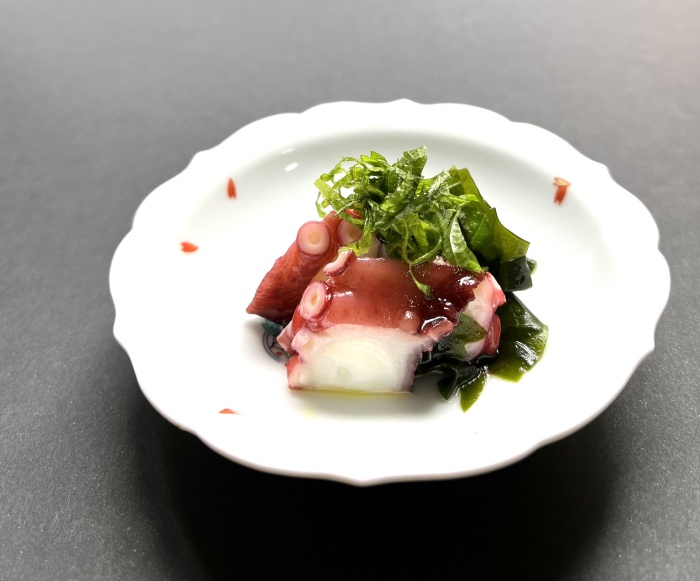 たことわかめのさわやか和え 真たこ(刺身用) 100g(食べやすい大きさに切る) ワカメ サッとゆでた状態で20g(食べやすい長さに切る) 肥前佐嘉角屋【野菜だれ】小さじ2 オリーブオイルまたはサラダ油 小さじ3 レモン果汁 1/4個分 お好みで青しそ 適量 ①たことわかめを容器に入れて【野菜だれ】オリーブオイル、レモン果汁で和える ②器に盛り付け青しそを添える
