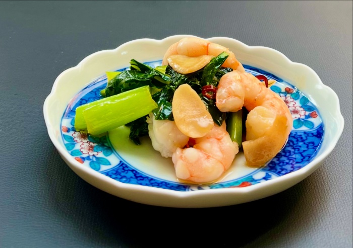 えびと小松菜のガーリック炒め (2人分) むき海老 12尾(背ワタをとり下処理をする) 小松菜 1株 50g程度(1~2㎝に切る) 肥前佐嘉角屋【野菜だれ】大さじ1 乾燥ガーリック 6~8枚程度(水につけて戻す) 輪切り唐辛子 お好み量 オリーブオイル 大さじ1 ①フライパンにオリーブオイル、唐辛子、ガーリックを入れ火をつける ②にんにくの香りが出てきたらむき海老を炒め、小松菜と【野菜だれ】を加え炒める ③器に盛り付ける