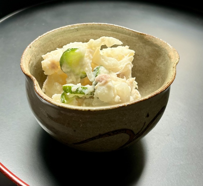 ポテトサラダ じゃが芋 大3個(皮を剥いて茹でる) 胡瓜 1本 (輪切り) 玉葱 1個(スライス) 肥前佐嘉角屋【野菜だれ】小さじ4 ツナ缶(汁をきる) マヨネーズ 大さじ3 こしょう 少々 ①茹でたじゃが芋を湯切りし小吹芋状態にして粗熱をとる ②胡瓜と玉葱にそれぞれ【野菜だれ】をかけて揉み水気を切る ③①と②とツナ缶を混ぜ合わせマヨネーズとこしょうで調味し器に盛り付ける