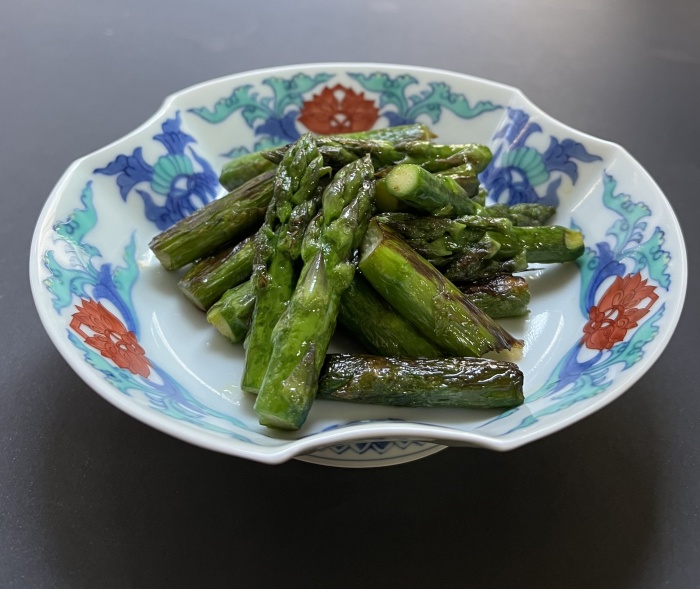 グリーンアスパラガスの炒め物 グリーンアスパラガス 7本(根元5ミリを除き、根元2㎝長さをピーラーで皮を剥むく) サラダ油 適量 肥前佐嘉角屋【野菜だれ】大さじ1 ①グリーンアスパラガスを手で2~3㎝ポキポキ折り、茎と穂先に分けて置く ②フライパンに油を熱し①の茎部分を重ならないようにフライパンをゆすって転がしながら焼く ③①の穂先と【野菜だれ】を加え水分を飛ばすように焼いて器に盛り付ける